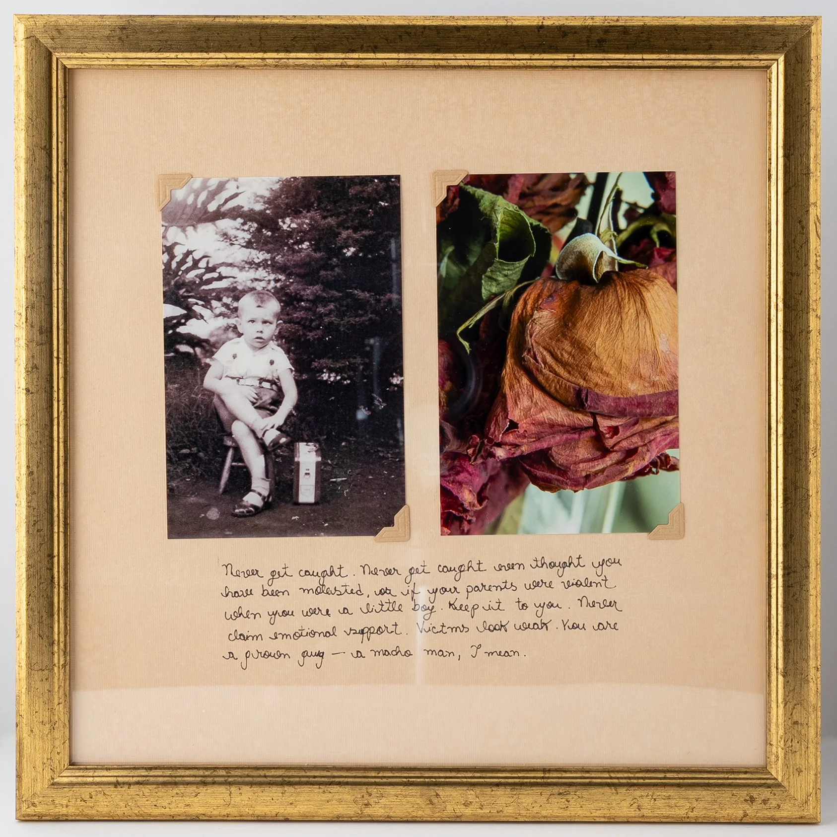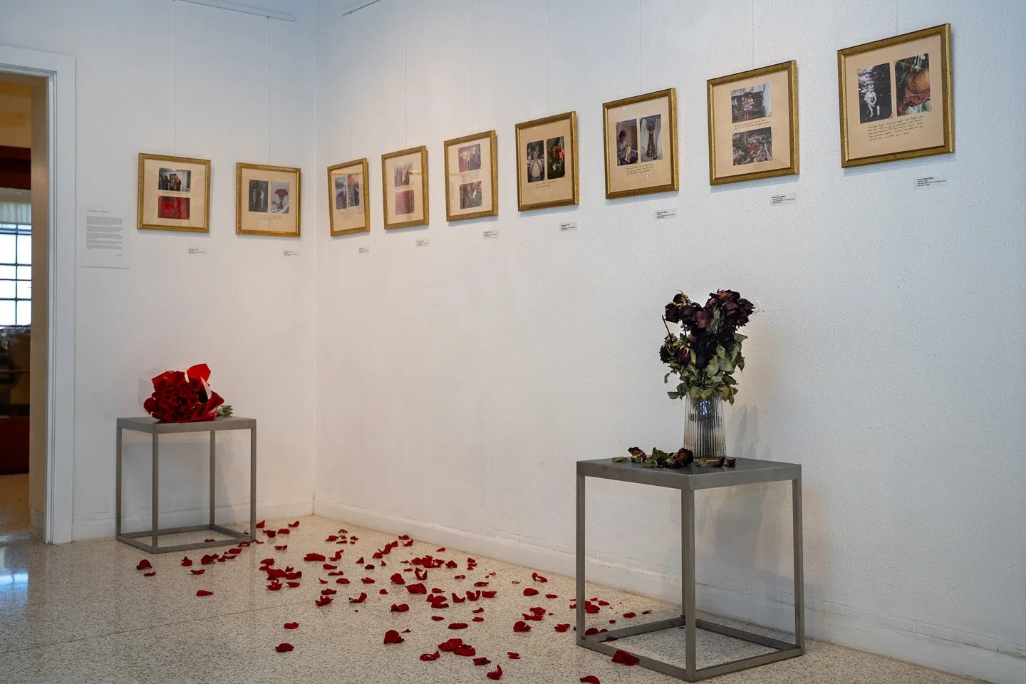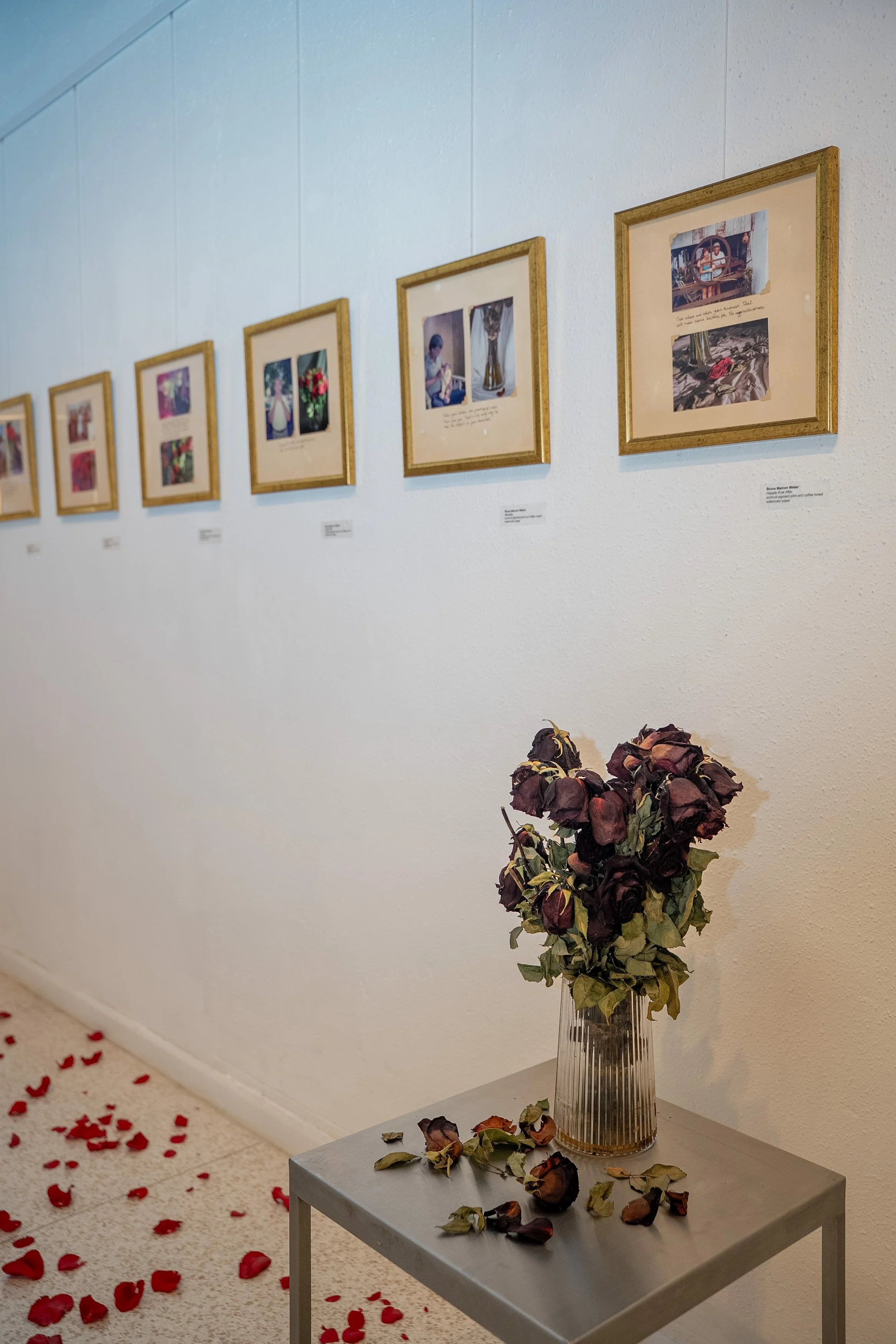 I put together the photographs and the evolution of a rose bouquet from its blossoming to death. I emulate a family album, placing prints casually on age-like sheets. They result crooked, as we would make at our homes. I take back the story. I rewrite without erasing it.