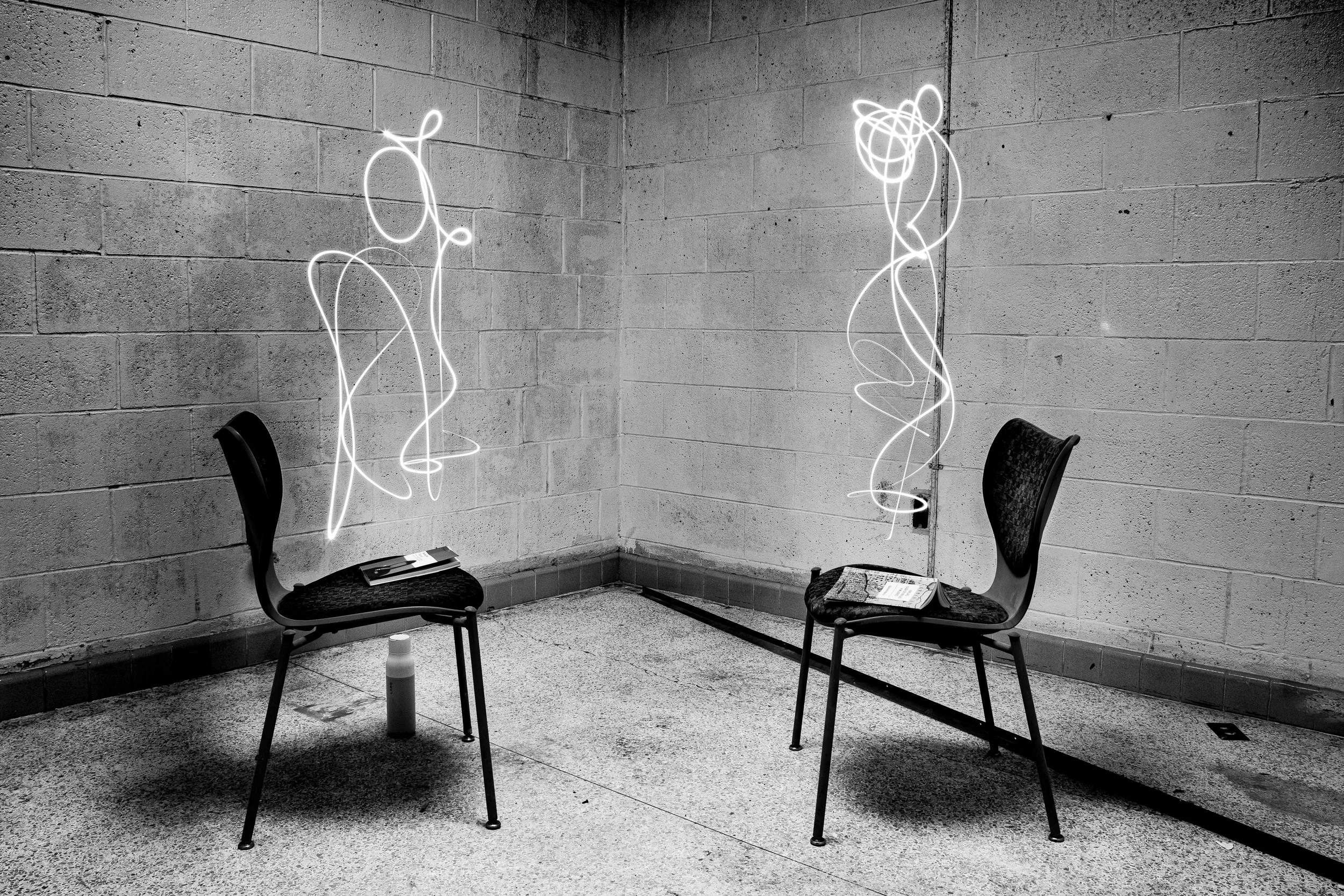A tough environment where a relaxed-easy going talking between two female individuals takes place. In actual life, those figures are not able to get together in the same room either because they are thousands of miles apart or because one of them is no longer alive. Thus, I represent them as spirits, using paint light techniques.